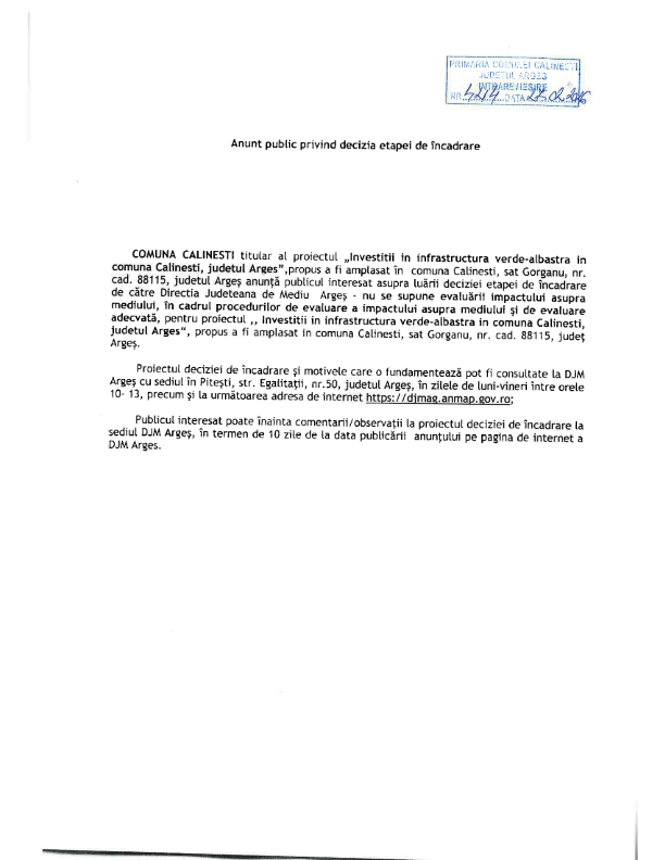 COMUNA CALINESTI titular al proiectului ,,Investitii in infrastructura verde-albastra in comuna Calinesti, judetul Arges”, propus a fi amplasat în comuna Călinești, sat Gorganu, nr. cad. 88115, județul Argeș anunță publicul interesat asupra luării deciziei etapei de încadrare de către Direcția Județeană de Mediu Argeș – nu se supune evaluării impactului asupra mediului, în cadrul procedurilor de evaluare a impactului asupra mediului și de evaluare adecvată, pentru proiectul ”Investitii in infrastructura verde-albastra in comuna Calinesti, judetul Arges”, propus a fi amplasat în comuna Călinești, sat Gorganu, nr. cad. 88115, județ Argeș.