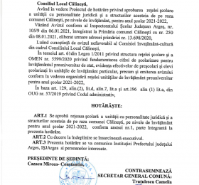 Hotararea nr 01 din 26.01.2021 Hotarare privind structura retelei scolare a unitatilor de invatamant din comuna Calinesti, in anul scolar...